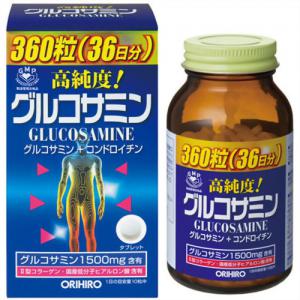 Глюкозамин 360 капсул Orihiro – это очищенный в процессе рекристаллизации глюкозамин в удобных капсулах. Суточная доза (10 капсул) содержит 1500 мг глюкозамина, 10 мг коллагена II типа, 1 мг гиалуроновой кислоты. Кроме того, в состав входит хондроитин из акульего плавника, цинк, кальций, магний, изофлавоны сои, витамин К2, фолиевая кислота и пр. Одной упаковки хватает на 36 дней.
